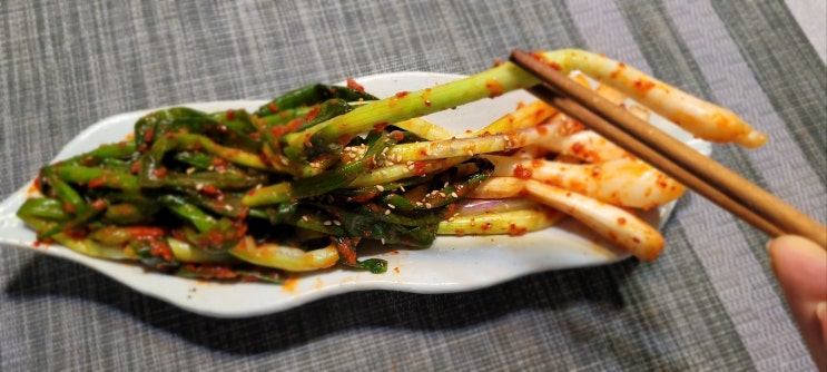우리 가족 너무너무 좋아하는 파김치에요. 아~ 보는데 또 콧등에 땀이 ... 맛난 거 보면 코가 먼저 반응하...