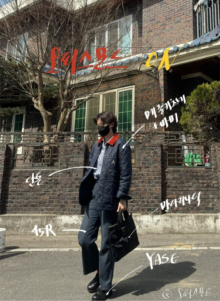 [직장인 코디] 메종키츠네 바버 콜라보 퀄팅자켓 야세 더비 슈즈 단톤 깅엄 체크셔츠 45R데님 아디다스 가젤 GY7339