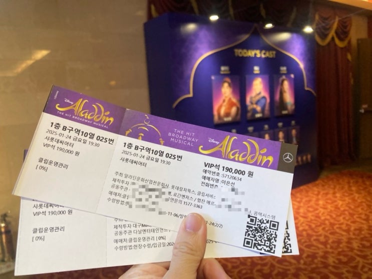 [샤롯데씨어터]뮤지컬 알라딘(정성화/박강현/최지혜 주연)/ 1층 B 구역 16열 15-17번 좌석