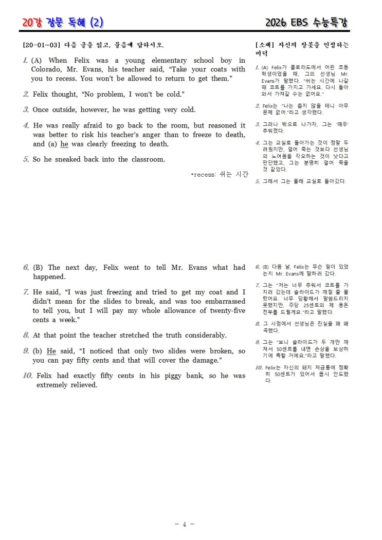 2026 EBS 수능특강영어 20강 좌지문 우해석 20강 장문 독해 (2) [20-01~03] 다음 글을 읽고, 물음에 답...