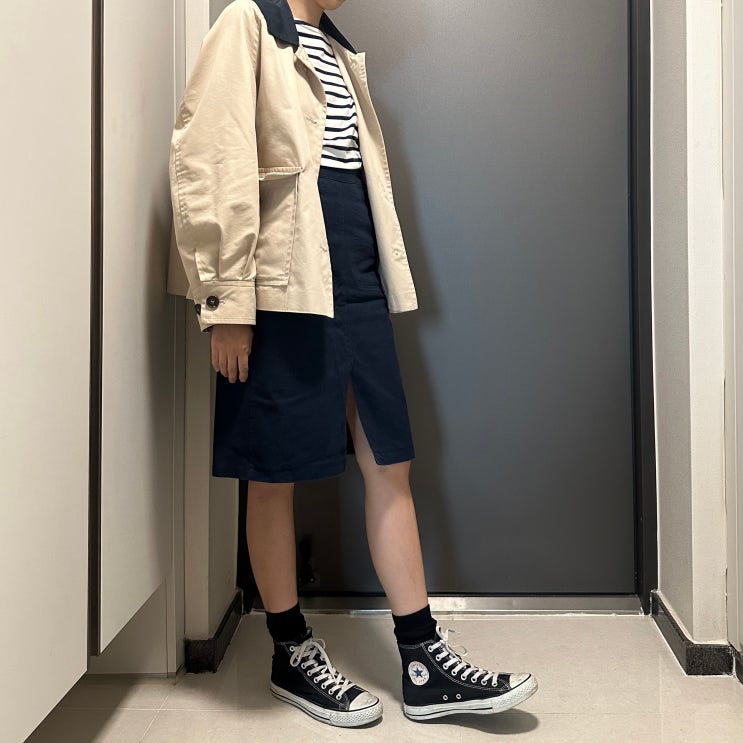 [2404] 스튜디오 톰보이 자켓, 스트라이프 티셔츠, 네이비 스커트, 컨버스하이