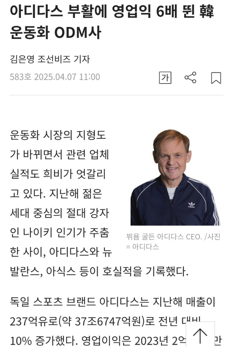 독일 스포츠 브랜드 #아디다스 는 지난해 매출이 237억유로(약 37조6747억원)로 전년 대비 10% 증가했다. ...