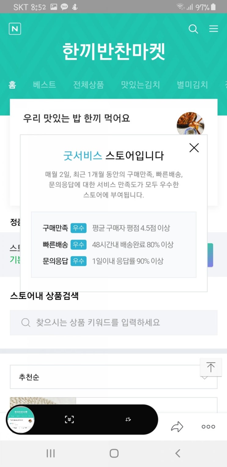 소문난반찬가게 한끼가 굿서비스 스토어로 선정됬어요