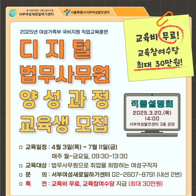 (국비지원 직업교육훈련) ★디지털법무사무원★ 취업, 무료 교육에 교육 참여수당까지! 서부여성새로일하기센터와 함께하세요