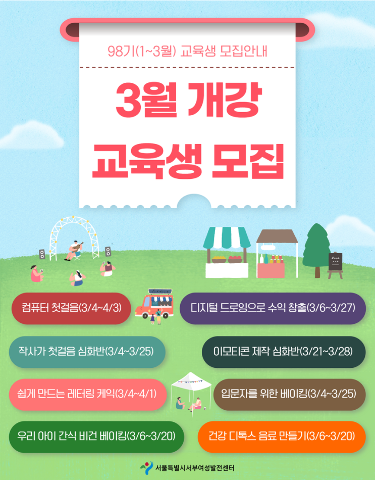 서부센터가 준비한 3월 개강 강좌! 1분기 교육과정 신청 시기를 놓치셨거나 3월 개강 일정을 찾으시는 분들...