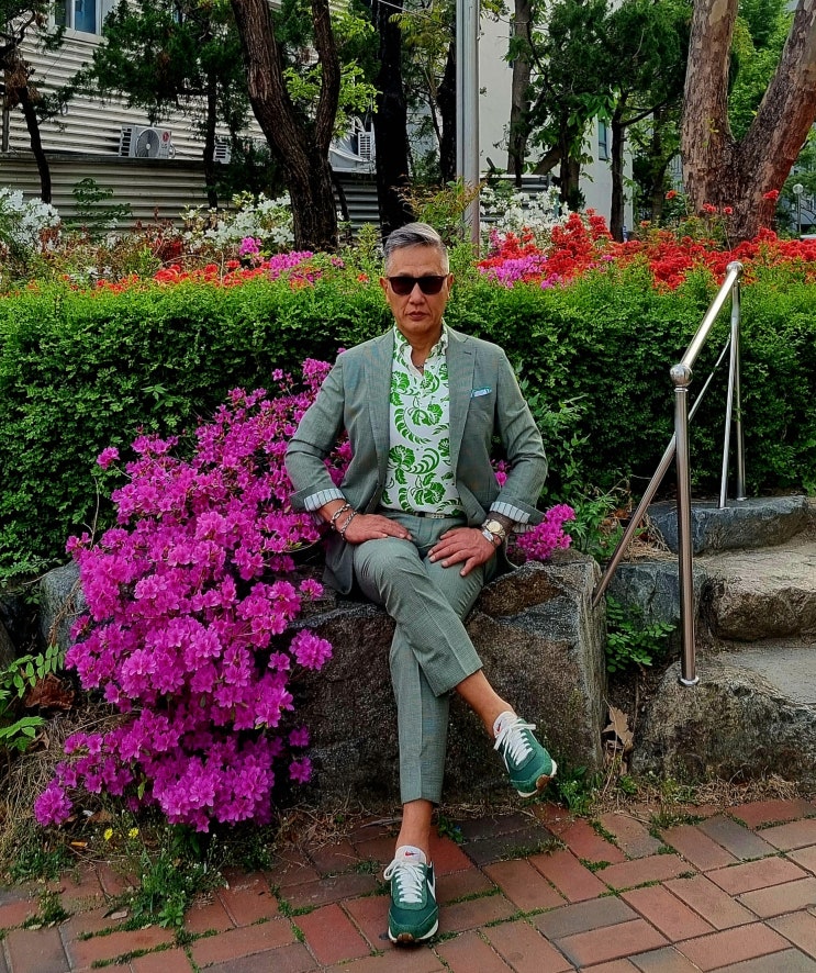 불량소년 2025년 4월 18일 금요일 데일리룩(시티 캐주얼 그린 톤 온 톤:핀 체크 슈트 정장, 버튼 다운 플라워 피켓 셔츠, 링벨트, 나이키 운동화 스니커즈)
