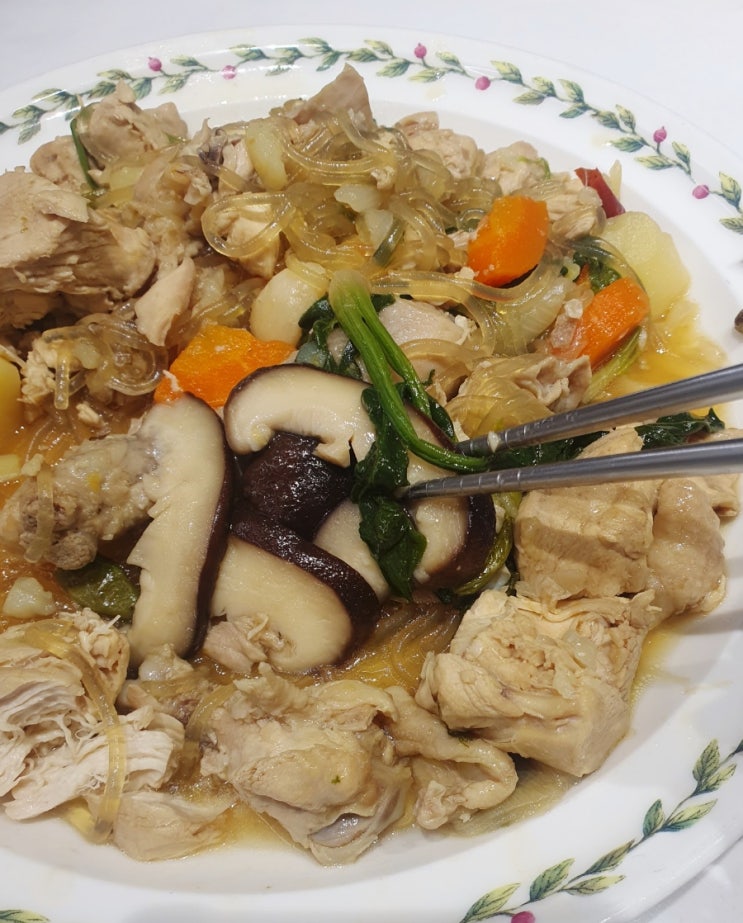 닭볶음용2마리,감자2개,당근반개,양파1개,표고버섯1개,마늘10개,애기고추7개,시금치한줌,당면 100g 양념; ...