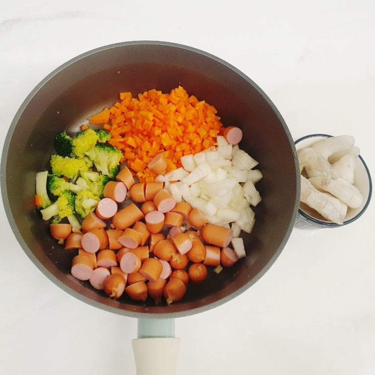 새우볶음밥 당근 1/2개,양파 1/2개,데친 브로콜리10조각 소시지 20개, 새우 6마리, 달걀 2개 아이들 방학을...