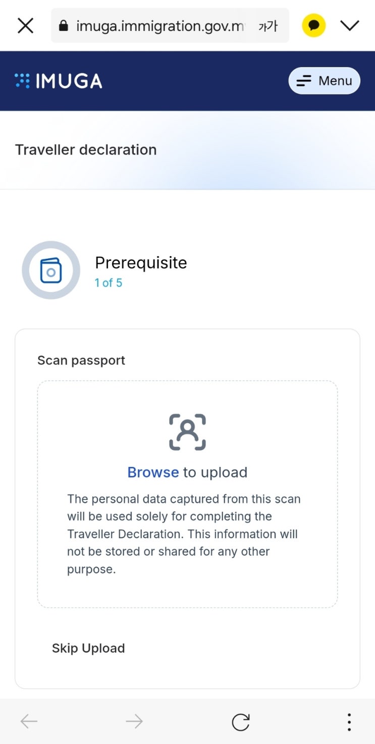 https://imuga.immigration.gov.mv/traveller/declaration 링크타고 열면 여권 파일 업로드 또는 스킵하고 ...