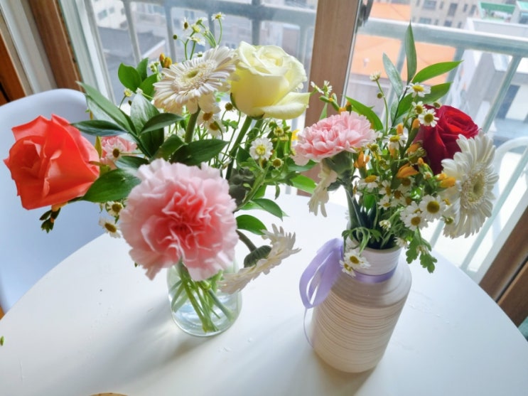 양재 꽃시장 꽃배달 후기 겸 꽃꽂이 정리 (feat 캐모마일 카네이션 장미 거베라 등등)