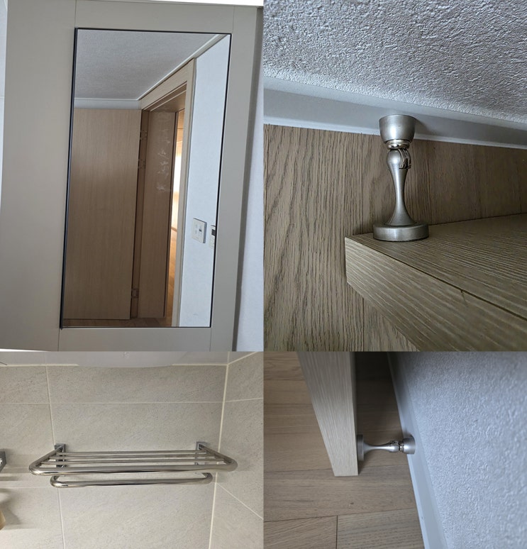 일광선반 - 장전래미안 작은방 수납장문, 프레임리스 흑틀 은경문, 방문스토퍼, 욕실수건선반 설치