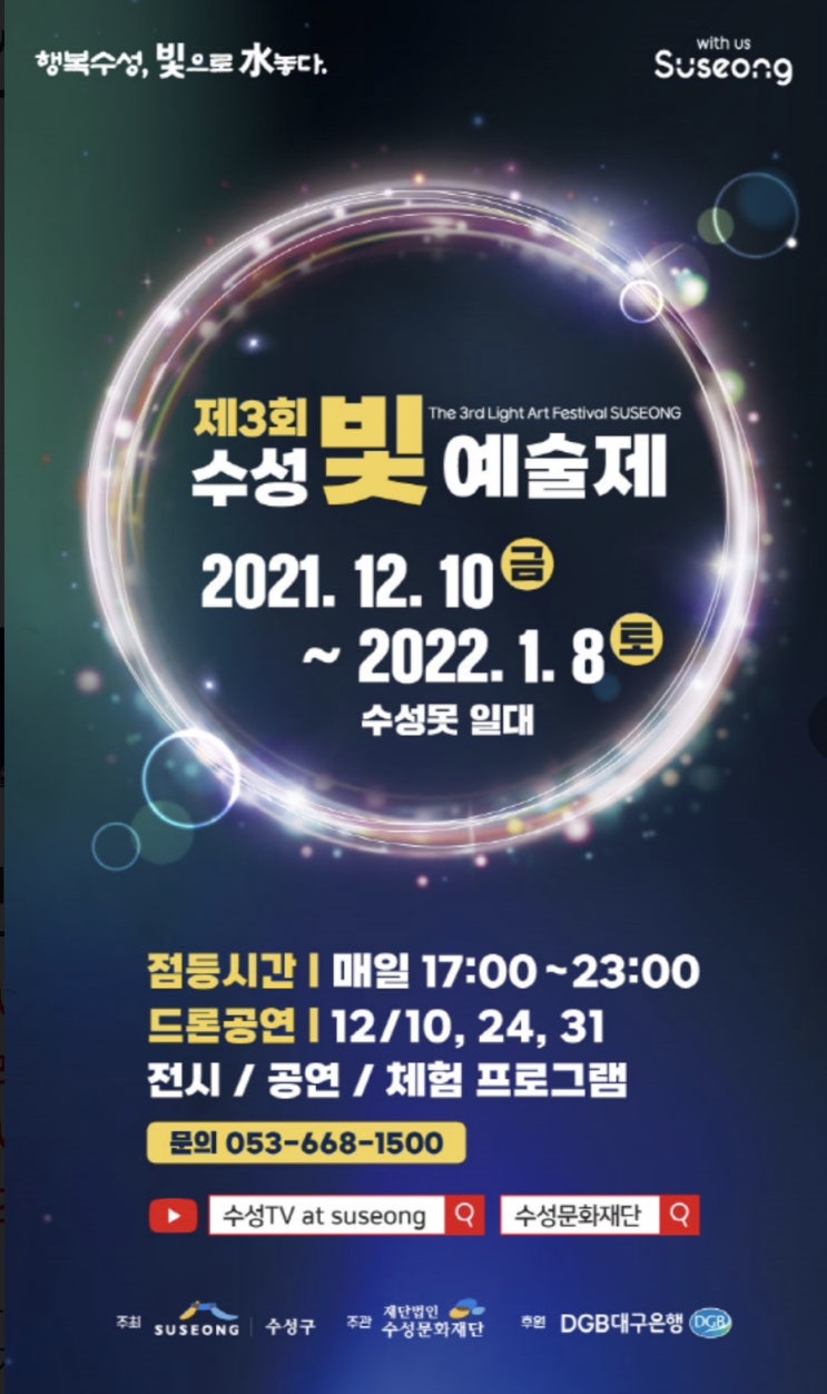 22/12/9 ~ 23/1/8 수성빛예술제가 수성못에서 열려요 12월 1일부터 평일 3시간 호텔 수성 무료 주차 가능하...