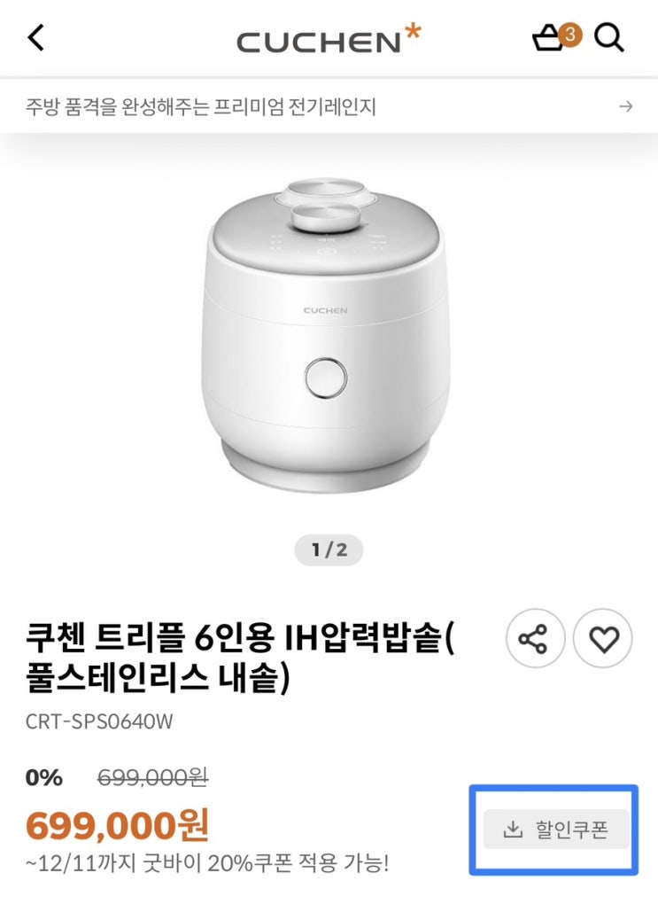 쿠첸 트리플 6인용 IH 압력밥솥 할인받아 구입