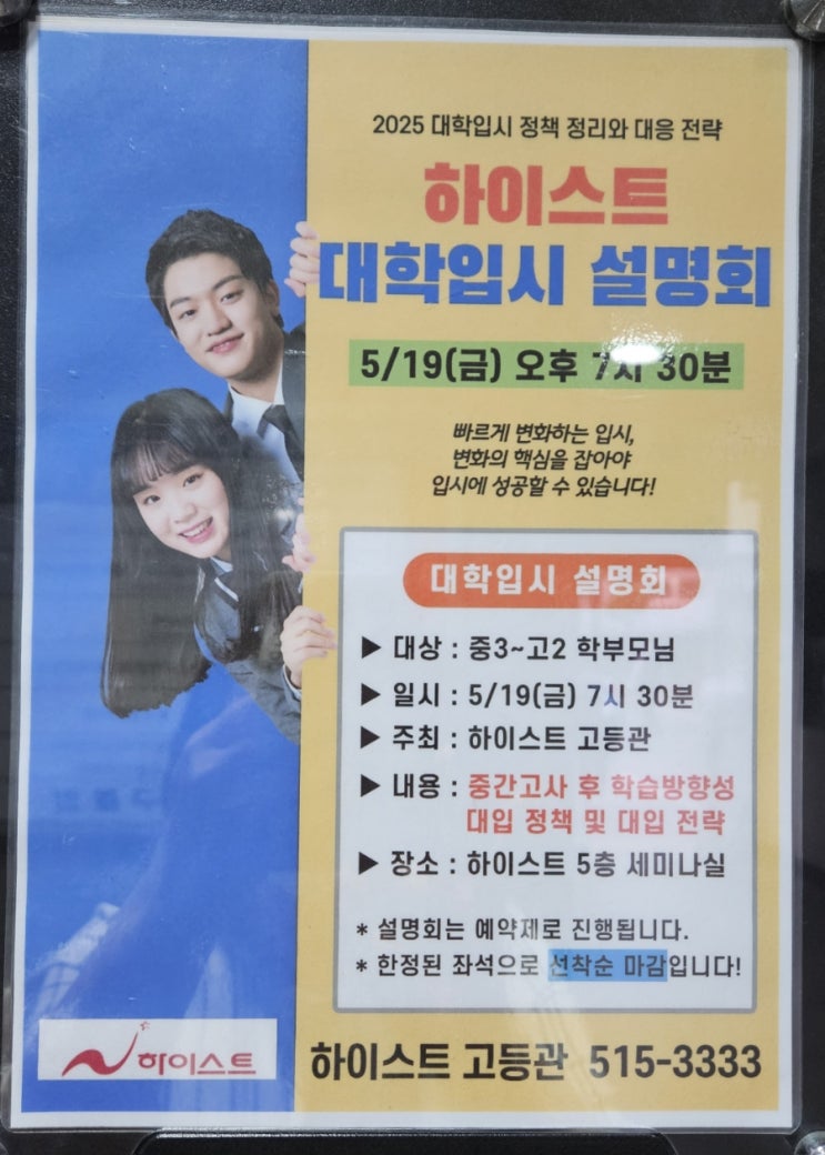 11월 3일 우리 부부는 부평 하이스트 예비 고1 입시설명회를 다녀왔다 중3은 고3이다 중3 학생들은 학원에...