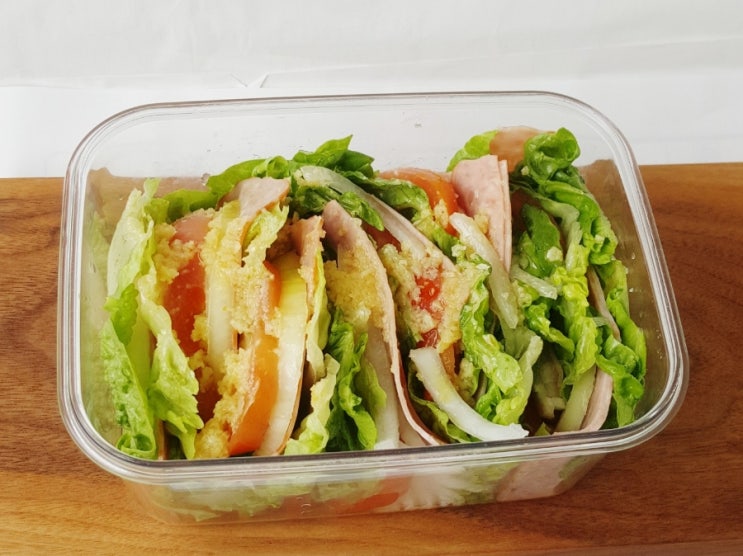 밀푀유 샐러드는 한 번에 많은 채소를 먹을 수 있고 소스를 바로부어 번거롭 지않게 도시락을 완성할 수 있...