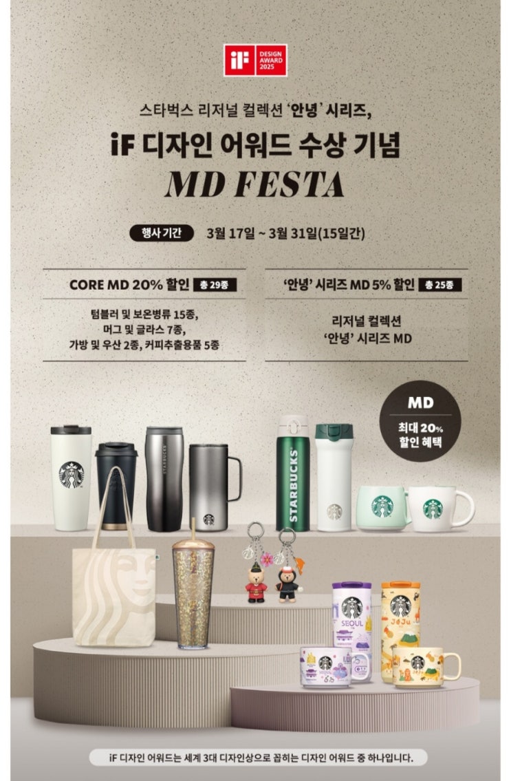 스타벅스 iF 디자인 어워드 수상 기념 MD FESTA "안녕"시리즈 25종 포함 최대 20%OFF혜택