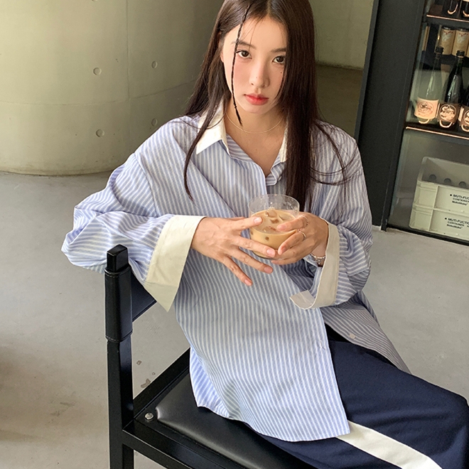 배색카라 스트라이프 셔츠 여성 블루 세로줄무늬 블라우스 직장인 정장 오버핏 남방