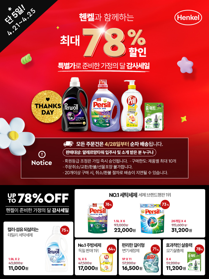 [25년 4월 패밀리세일] 헨켈 패밀리세일 - 시세이도헤어, 퍼실, 프릴, 퍼울, 컴배트, 홈키파 등 4/25(금)까지 Up to 78%