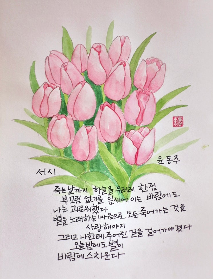 # 윤동주 시 '서시'- 분홍 튤립꽃 수채화그림 ' 서시' 캘리그라피 글씨 필사 튤립꽃 '생화 이미지' 무료나눔 감사합니다