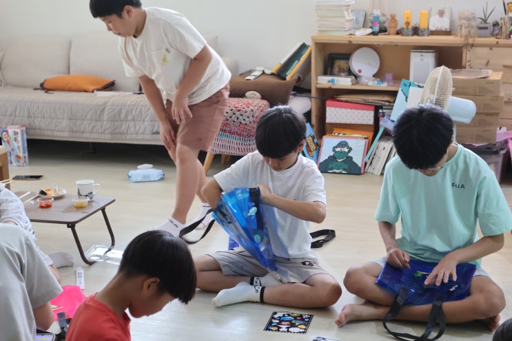 비치백 꾸미기에 여념이 없는 아이들 비치백에 마음에 드는 스티커를 붙이기 다 끝냈으니 v컷 한 장