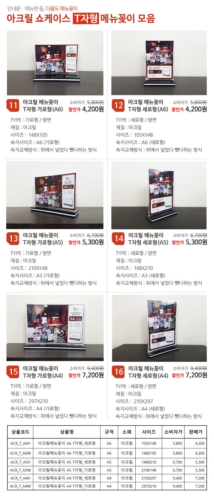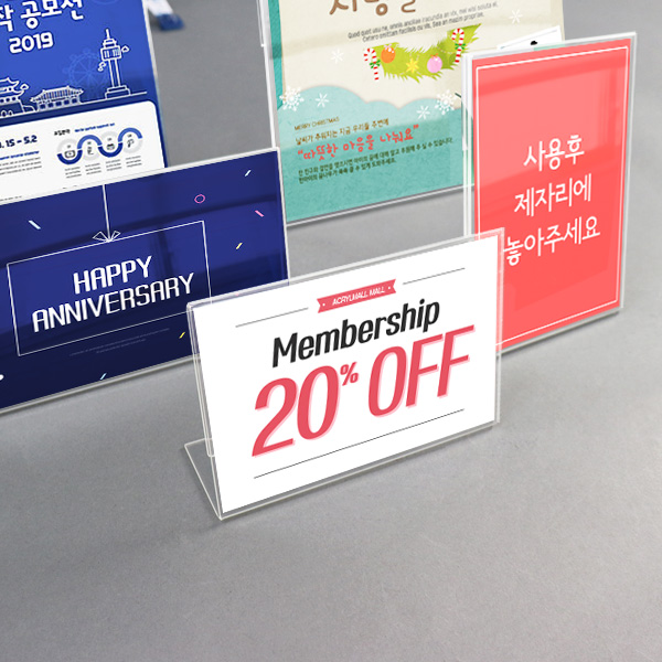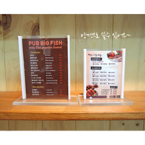 간소하면서도 실용성 있는 아크릴 메뉴꽂이 T자형 입니다. 측면으로 속지를 넣었다 뺐다 할 수있는 아크릴...