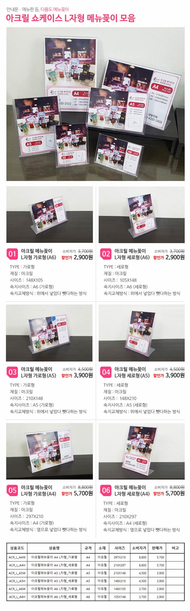 간소하면서도 실용성 있는 아크릴 메뉴꽂이 L자형 입니다. 측면으로 속지를 넣었다 뺐다 할 수있는 아크릴...