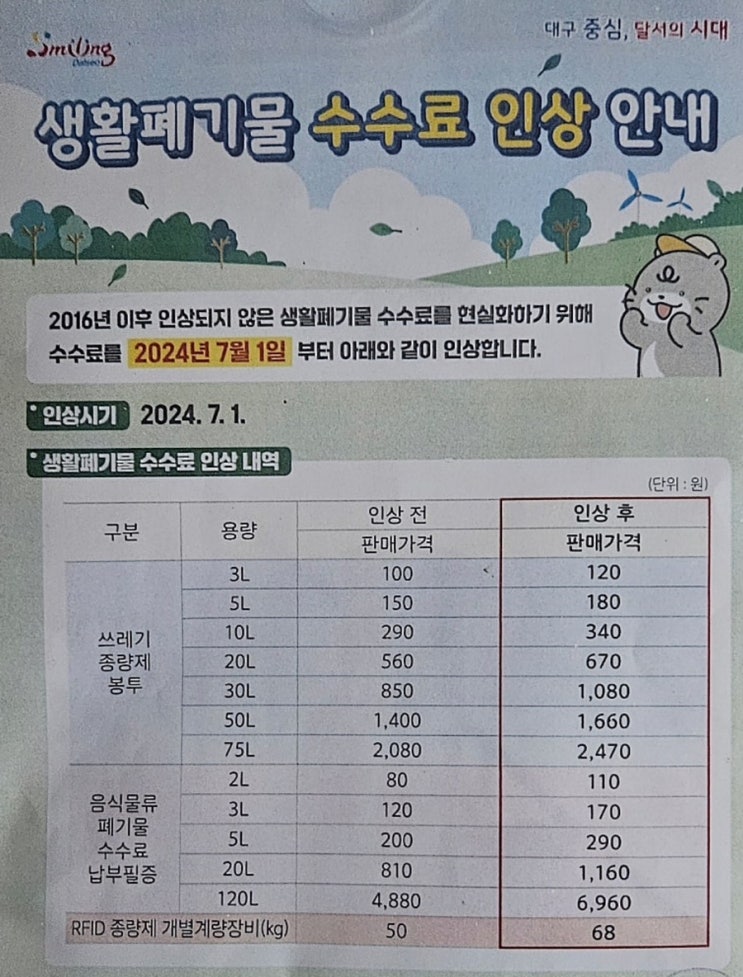 대구 쓰레기봉투 종량제봉투 가격 인상 생활폐기물 인상 7월 1일 구매부터 적용