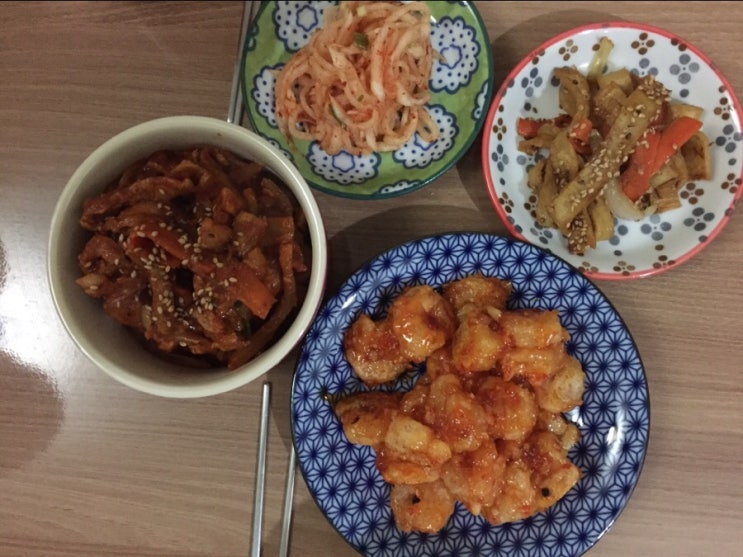 월요일 오늘 훈이가 낮잠을 오래자서 반찬을 좀 넉넉하게 만들었다 무생채, 어묶볶음, 제육볶음, 칠리새우 ...
