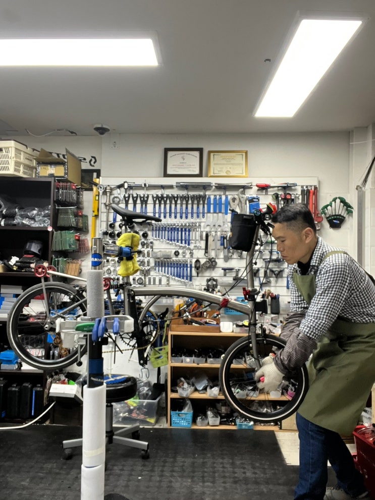 브롬톤 자전거 바퀴 펑크 수리와 세차 작업