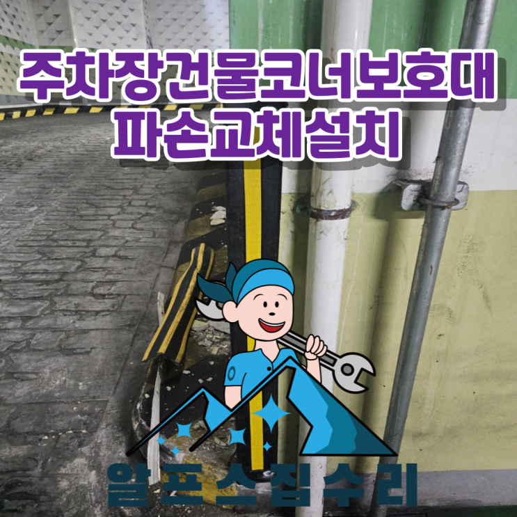 내집처럼 깔끔하게 알프스처럼 시원하게 집수리 전문가 알프스집수리입니다. 주차장건물 코너 보호대 파손...