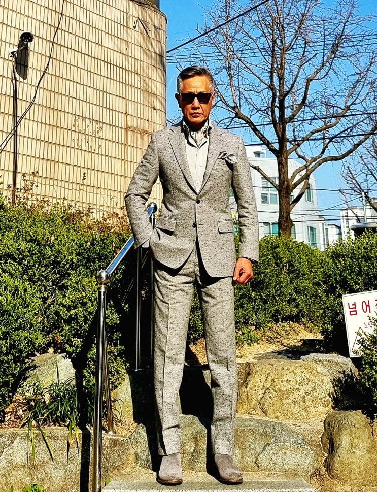 불량소년 2025년 3월 22일 데일리룩(라이트 그레이 톤 온 톤:면 홈스방 캐주얼 슈트 정장, 플란넬 셔츠, 첼시 부츠, 실크 머플러)