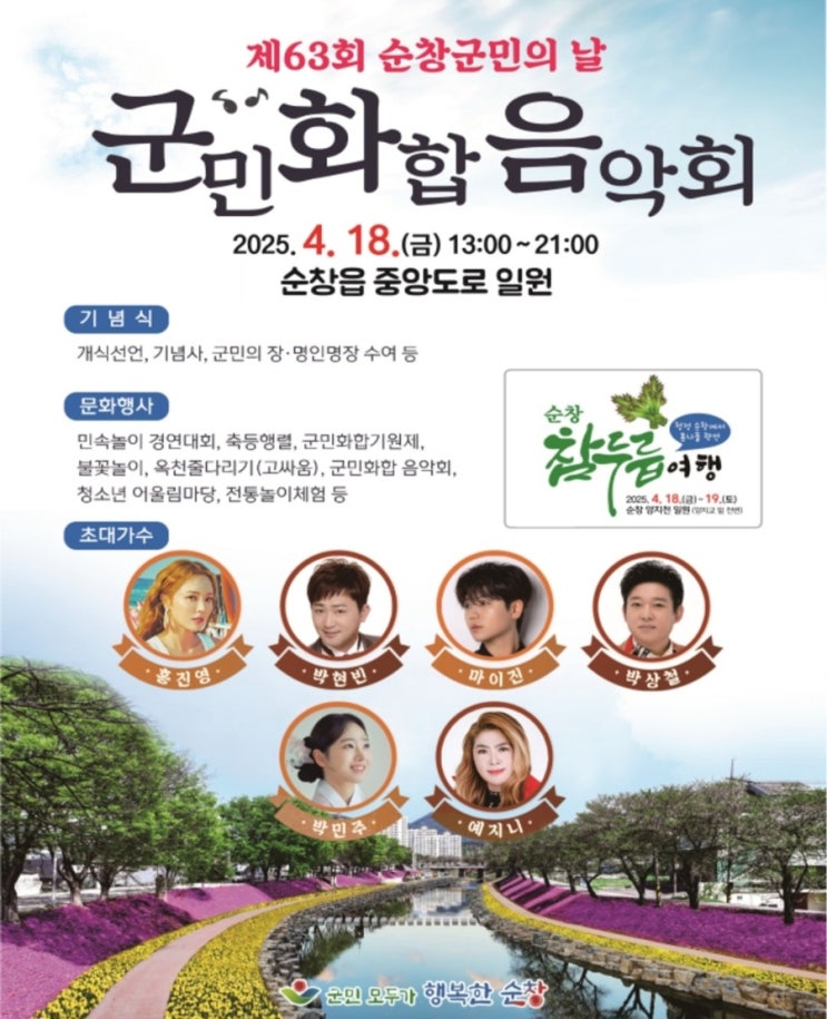 제63회 순창군민의날 군민 화합 음악회 4월 18일(금) 오후 1시 제63회 순창군민의 날을 맞아 순창읍 중앙도...