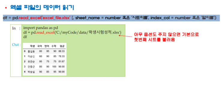 엑셀 파일 읽기 read_excel 옵션 : sheet_name = number 혹은 '시트이름' index_col ...