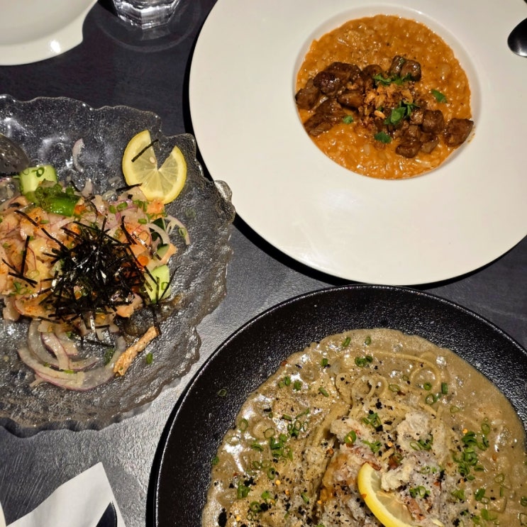 신논현역 《로쿄》 이탈리안과 일식 퓨전 다이닝집 저녁 식사 후기(카니미소 아게 파스타 굳)
