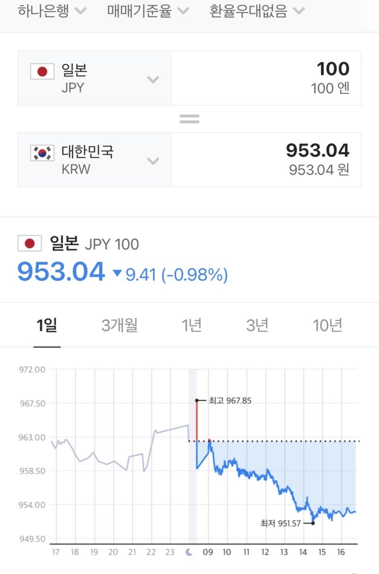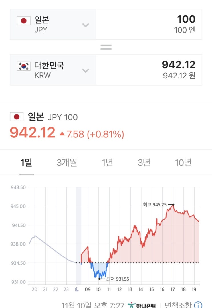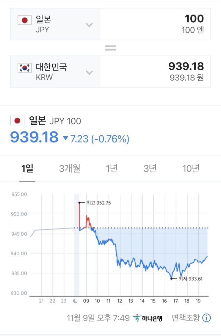 며칠 엔화를 보지 못하도록 바빴는데 오늘 보니 며칠 전과 동일하네…ㅠㅠ 최저 937원까지 내려갔으나 마지...