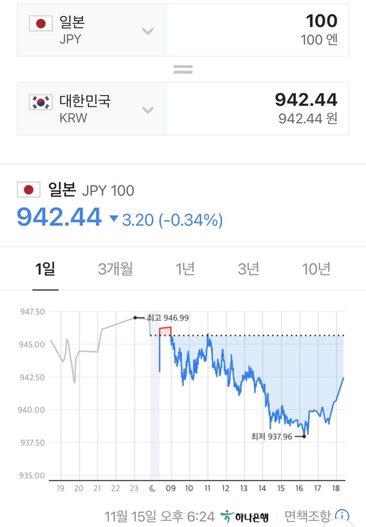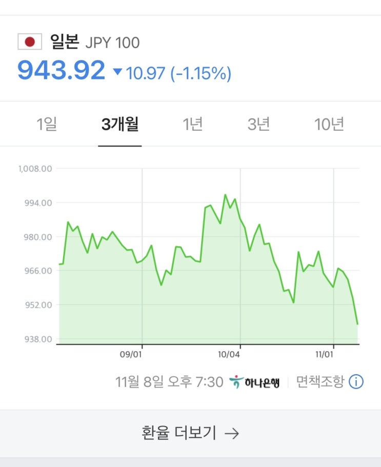 11월 8일 화요일 엔화 완전 폭락!!ㅠㅠ 943원으로 3개월 추세를 보면 아시겠지만 매일 최저최저 했지만 이...