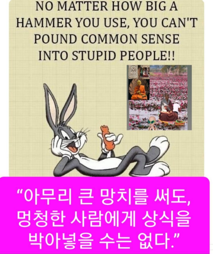해석: “아무리 큰 망치를 써도, 멍청한 사람에게 상식을 박아넣을 수는 없다!!” 즉, 어리석은 사람에게 아무리 강하게 말해도, 상식이 통하지 않는다는 말이야. 말로 해도 안 되