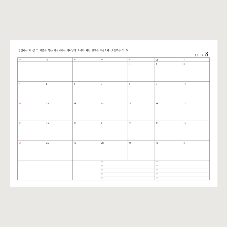 2024년 8월 달력 프린트 가능합니다 :) 굿노트 먼슬리 플래너 PDF