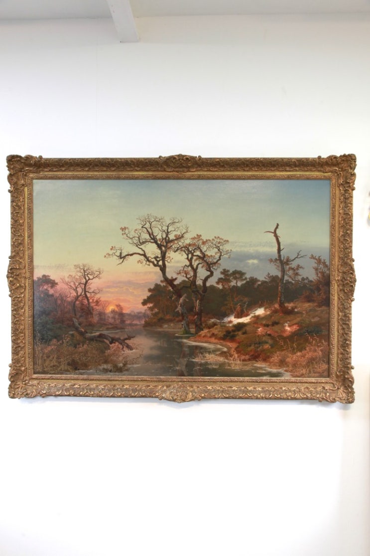 독일 대형(134cm) 1849년 오리지날 유화작품 '해질녘 겨울 호수가의 사냥꾼들' / Wilhelm Porttmann(1819-1893)