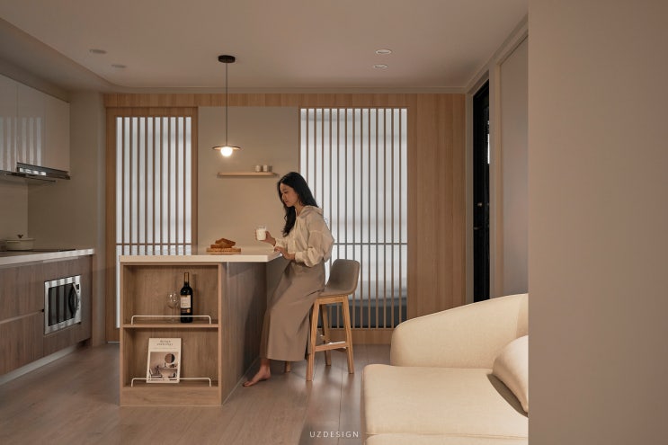 벽 대신 간살 슬라이딩도어 아일랜드 주방인테리어 아일랜드 식탁제작