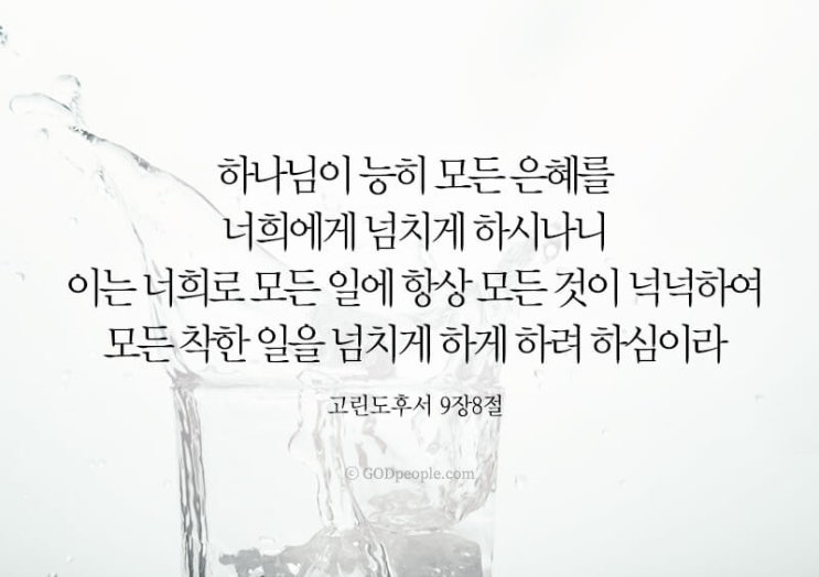 고후9:8 하나님이 능히 모든 은혜를 너희에게 넘치게 하시나니 이는 너희로 모든 일에 항상 모든 것이 넉넉...