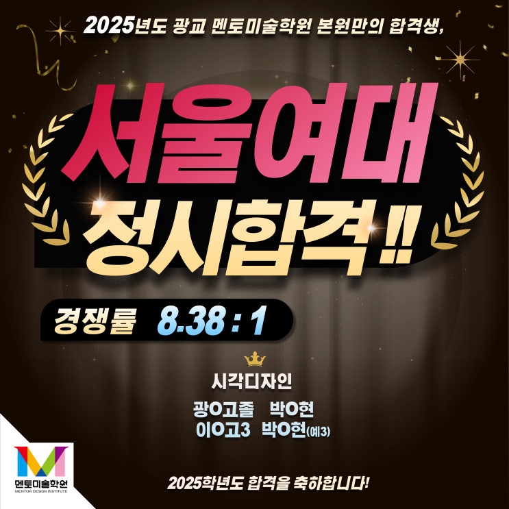 안녕하세요 여러분~!! 멘토미술학원입니다. 멘토 입시반 합격행진!! 2025 서울여자대학교 정시 최초합격자...
