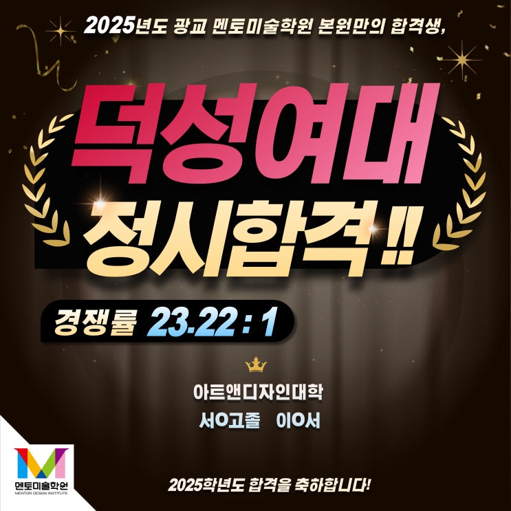 안녕하세요 여러분~!! 멘토미술학원입니다. 멘토 입시반 합격행진!! 2025 덕성여자대학교 정시 최초합격자...