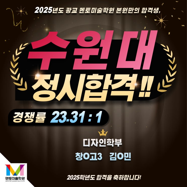 안녕하세요 여러분~!! 멘토미술학원입니다. 멘토 입시반 합격행진!! 2025 수원대학교 정시 최초합격자가 나...