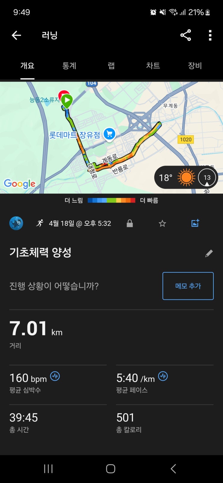[러닝일지] 25.4.18. 조깅, 7km, 가민 포러너 55 레이스 예상 수치 변화