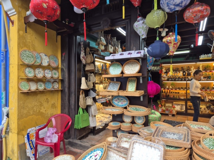아침에 또 호이안 시장구경가기~ㅎㅎ 기념품들 보니 라탄과 자개의 조화로 만든 컵받침과 쟁반들이 보이네...