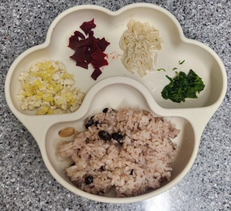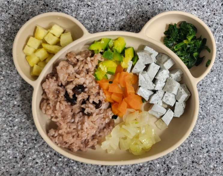 10개월 아기 자기주도이유식/ 콩밥 / 고구마큐브 / 애호박큐브 / 다진 시금치 나물 / 당근큐브 / 흑임자 두부 큐브 / 양파 큐브