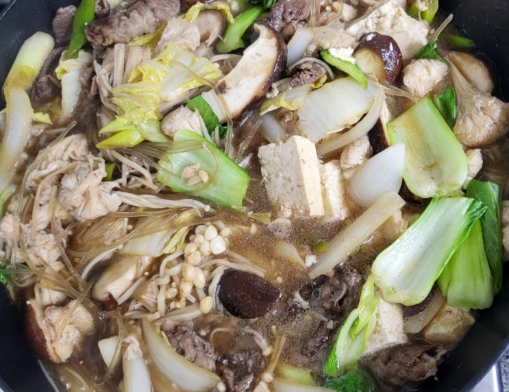 스끼야끼 만들기 재료 ㅡ 버터 ㅡ 샤브용 소고기 500g ㅡ 청경채 ㅡ 알배추 ㅡ 양파 ㅡ 대파 ㅡ 팽이버섯 ...