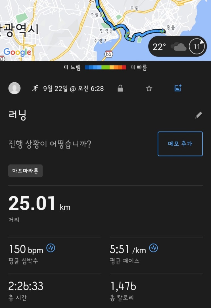 주말 LSD훈련 교대역 온천천에서 해운대 문탠로드 입구까지 주말에는 장거리 달리기 훈련. 토요일에 비...