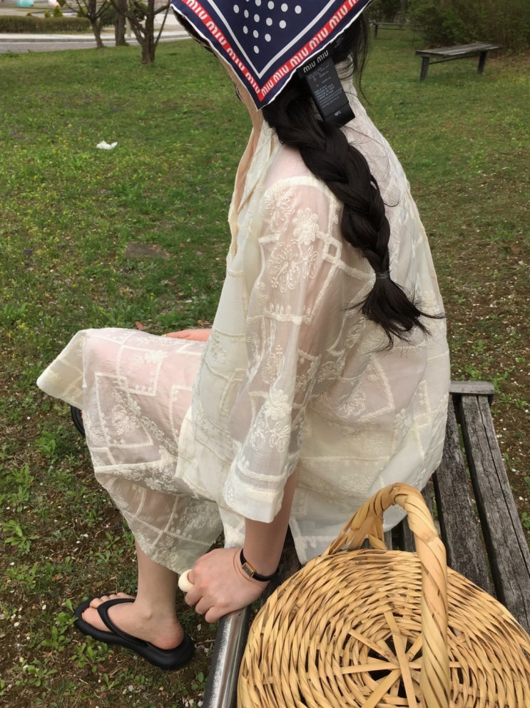 레이스 반팔 셔츠 에이치라인 롱 스커트 셋업 플라워 패턴의 퓨어코튼과 폴리가 블랜딩 된 아이렛 자수 소...